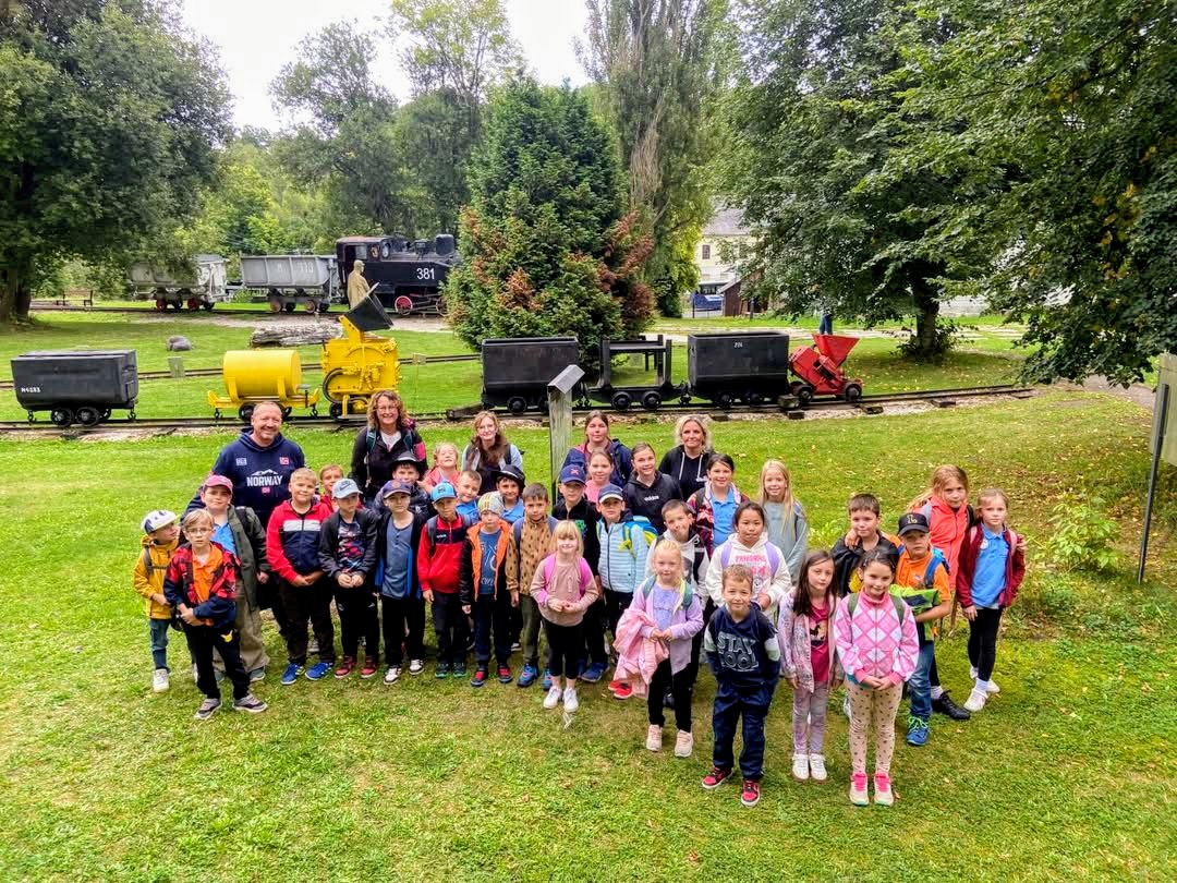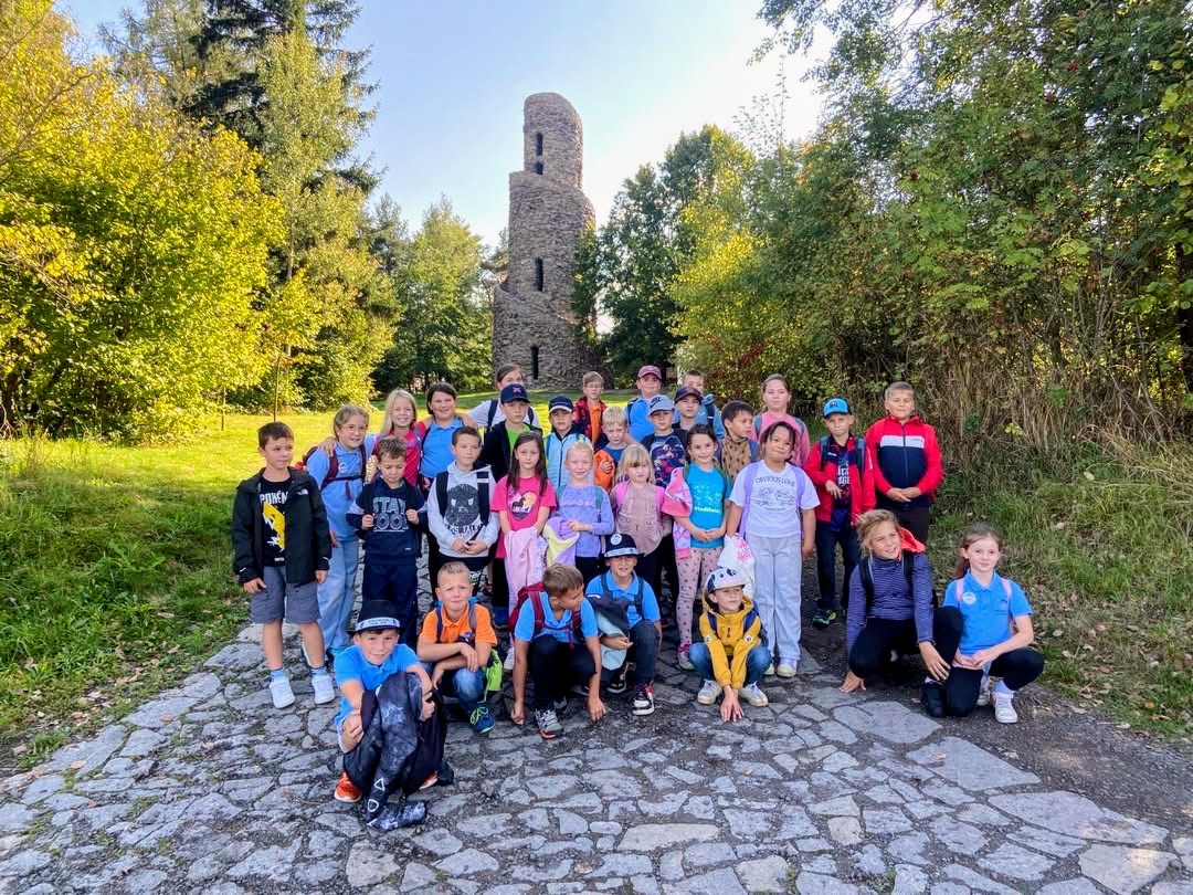 Am 11.09.2025 war es endlich so weit. Voller Aufregung stiegen 14 Drittklässler der Grundschule Steinberg in den Bus nach Chyše. Nach zweieinhalbstündiger Fahrt wurden wir freudig von den 17 Schülerinnen und Schülern der Partnerschule begrüßt. Nach einem ausgiebigen Mittagessen besuchten wir das Bergbaumuseum in Krásno, wo uns viel Interessantes über den Zinnabbau und das Leben eines Stollenarbeiters beigebracht wurde. Besonders die Besichtigung der historischen Räumlichkeiten und eine Fahrt mit der Grubenbahn werden uns dabei noch lange in Erinnerung bleiben. Anschließend hatten wir die Möglichkeit, zu Tschechiens schönsten Aussichtturm zu wandern und dort den spektakulären Ausblick zu genießen. Ein weiteres Highlight war definitiv die gemeinsame Übernachtung im Schulgebäude, wo bis weit über die Schlafenszeit hinaus Geheimnisse zwischen den Schlafsäcken ausgetauscht wurden. Nach einer kurzen Nacht durften wir im örtlichen Gestütshof alle 50 Turnierpferde streicheln und den Besitzer mit Fragen löchern. Gesättigt und voller neuer Eindrücke traten wir schließlich wieder die Heimreise an.